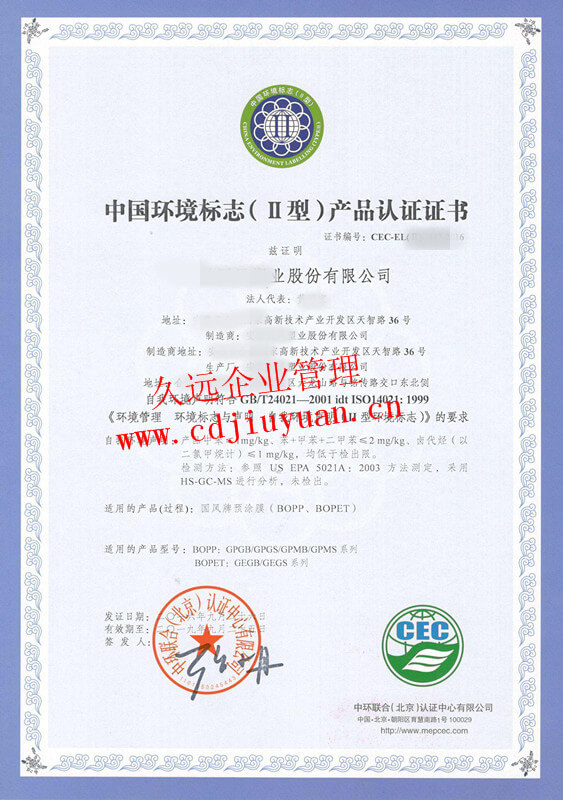 中國(guó)環(huán)境標(biāo)志產(chǎn)品II型認(rèn)證證書(shū)(十環(huán)II型)