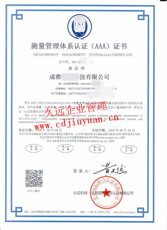 測(cè)量管理體系認(rèn)證證書(shū)