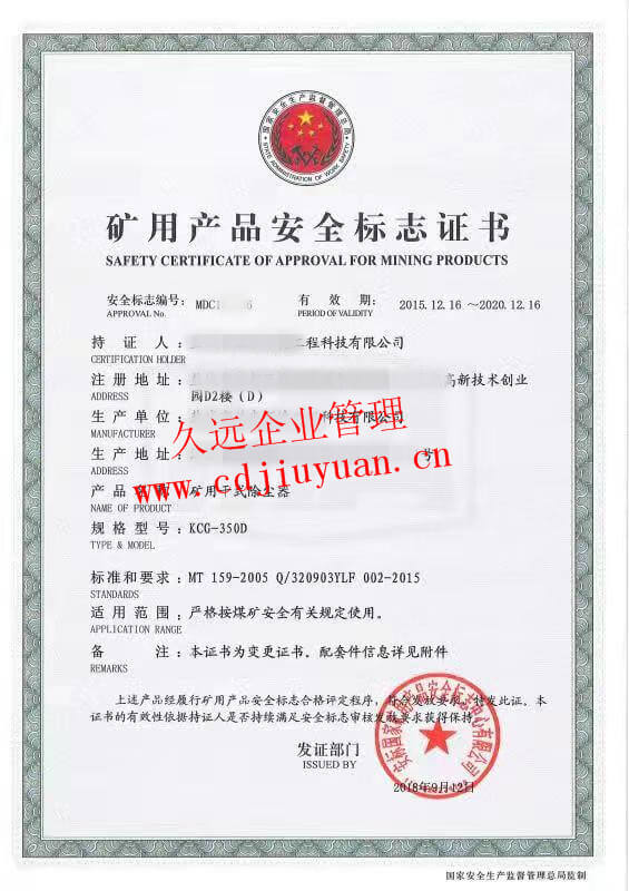 礦用產(chǎn)品安全標(biāo)志認(rèn)證證書(shū)