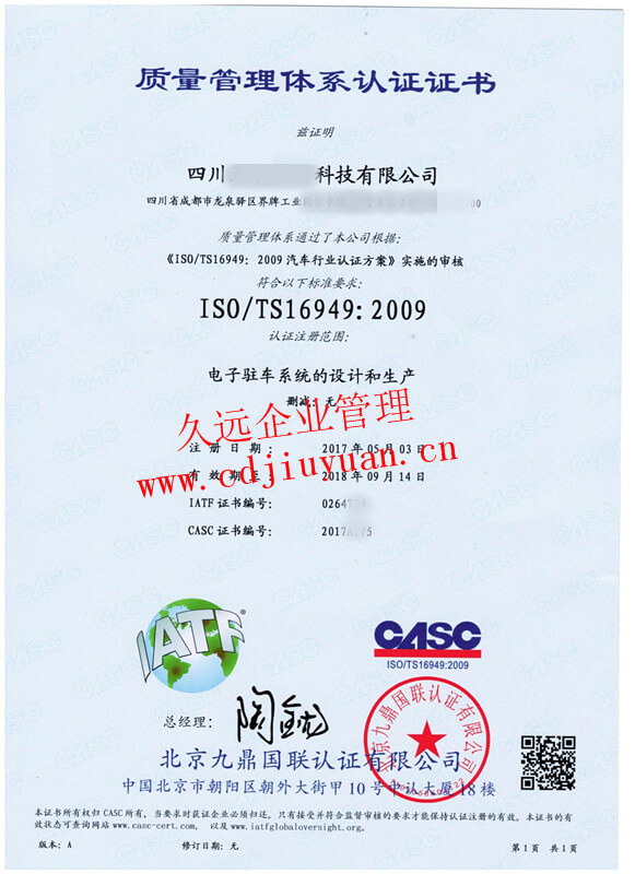 IATF16949汽車(chē)質(zhì)量管理體系認(rèn)證證書(shū)